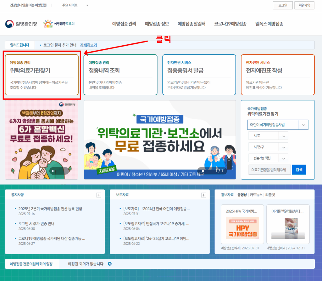 - 상단 메뉴 → “예방접종 기관 찾기” 클릭